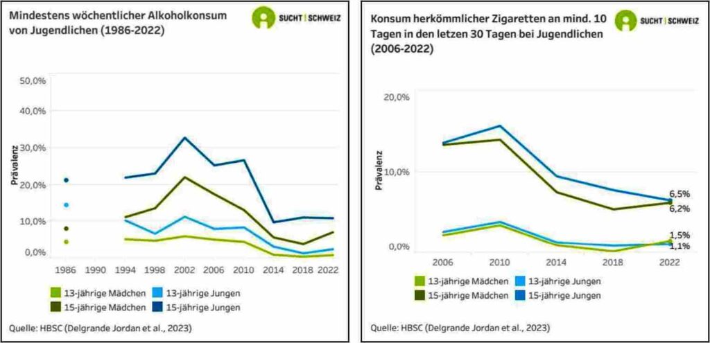 Eine andere Zahlenreihe bestätigte 2022 die zunehmende Geschlechtergleichheit bei Suchtmitteln: Weibliche wie männliche 15-Jährige gaben zu 25 beziehungsweise 25,1 Prozent an, in den vergangenen 30 Tagen Tabakprodukte konsumiert zu haben. «Mehr als jeder vierte Jugendliche raucht – fast jeder zweite trinkt», titelten die Tamedia-Druckausgaben (online ohne Abo). Demnach gaben 43 Prozent der Befragten an, sie hätten mindestens einmal in den letzten 30 Tagen Alkohol getrunken, ohne Unterschied der Geschlechter. Bei der Quelle, Sucht Schweiz, findet man für häufigeres Trinken Prozentzahlen; sie lagen für Mädchen etwa um einen Viertel niedriger als für Burschen.