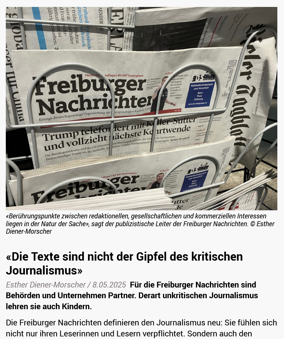 Definitiv sehr abhängig sind die «Freiburger Nachrichten». Ich habe für meinen Artikel deren publizistischen Leiter Marc Lehmann mit meinen Vorwürfen konfrontiert. Es kümmerte ihn nicht, dass es bei den «Freiburger Nachrichten» zwischen Journalismus und Werbung keine klaren Grenzen gibt. Er erklärte sogar: «Dass Berührungspunkte bestehen zwischen redaktionellen, gesellschaftlichen und kommerziellen Interessen, liegt in der Natur der Sache. Angesichts der extrem angespannten Lage in der gesamten Medienbranche, geht es darum, einen für alle Seiten gangbaren Weg zu finden. Wer glaubt, das publizistische Geschäft könne im lokalen Raum völlig losgelöst von den Akteuren funktionieren, scheint die Mechanismen in dieser räumlichen Nähe nicht ganz zu verstehen.»