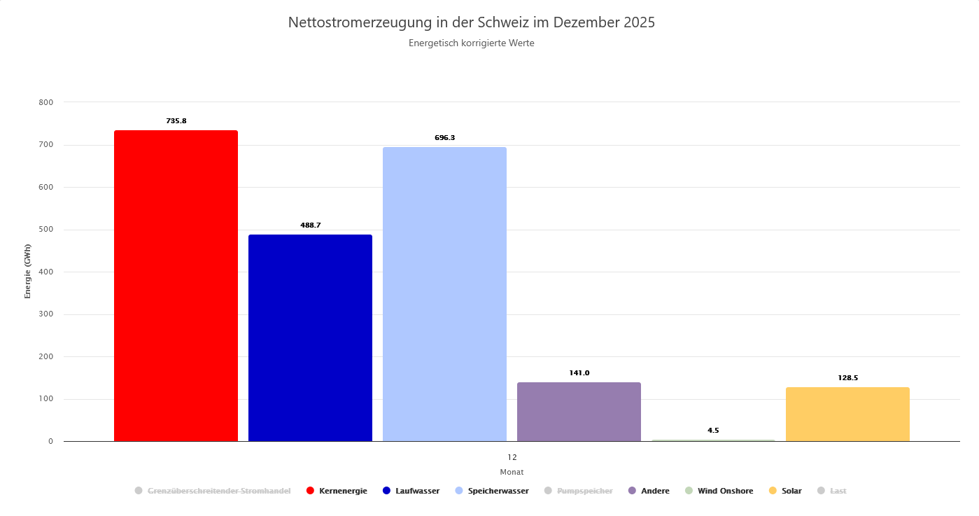 Welcher Energieträger tatsächlich wie viel zur Schweizer Stromproduktion beiträgt, zeigen die absoluten Zahlen in den Swiss Energy-Charts. Klar ist: Am wichtigsten ist die Wasserkraft vor der Atomkraft und der Sonnenenergie. Unbedeutend ist die Windkraft.