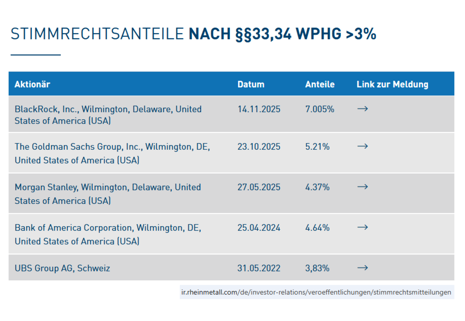 Ganz vorne dabei ist Blackrock, der grösste Vermögensverwalter der Welt. Er bietet den Anlegern verschiedenste Anlageprodukte an, die zum Beispiel in Rheinmetall investieren. Zählt man alle Stimmrechte zusammen, die Blackrock im Auftrag seiner Investoren an der Hauptversammlung von Rheinmetall ausüben könnte, so kommt man auf sieben Prozent (siehe Grafik unten). Auch Investment- und Grossbanken wie Goldman-Sachs, Morgan-Stanley, Bank of America oder die UBS bringen es auf beachtliche Stimmrechte.