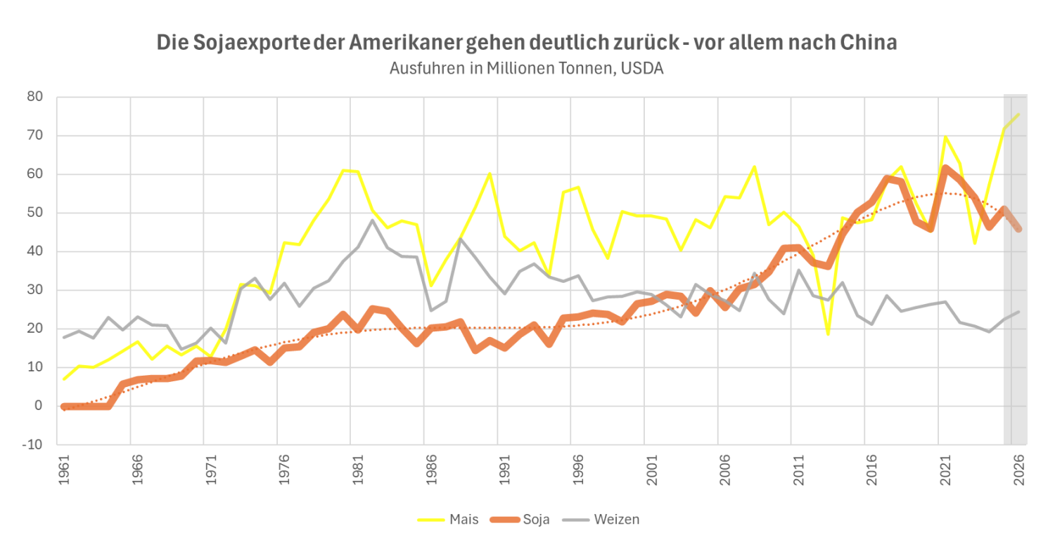 Die Sojaexporte der Amerikaner gehen zurück. Hier gibt es eine grössere Auflösung der Grafik.